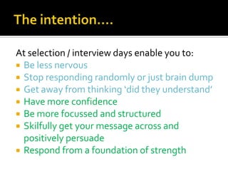 1) The document discusses building confidence through focusing on strengths, beliefs, communication skills, and being prepared.