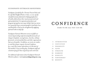 The document outlines the mission and beliefs of Guideposts Outreach Ministries, established by Norman Vincent Peale and Ruth Stafford Peale, focusing on helping individuals achieve personal and spiritual potential through inspirational stories and faith-based support. It emphasizes the importance of confidence, faith, and positive thinking, sharing practical advice and biblical encouragement to foster a mindset of self-belief and resilience. The text also reflects on Peale's legacy as a minister and author, promoting modesty and service to others as key components of a fulfilling life.