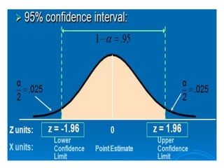 This document discusses confidence intervals, which provide a range of values that is likely to include an unknown population parameter based on a sample statistic. It defines key concepts like confidence level, confidence limits, and factors that determine how to set the confidence interval like sample size, population variability, and precision of values. It explains how larger sample sizes and more precise measurements result in narrower confidence intervals. Applications to clinical trials are discussed, showing how sample size impacts the ability to make definitive recommendations based on trial results.