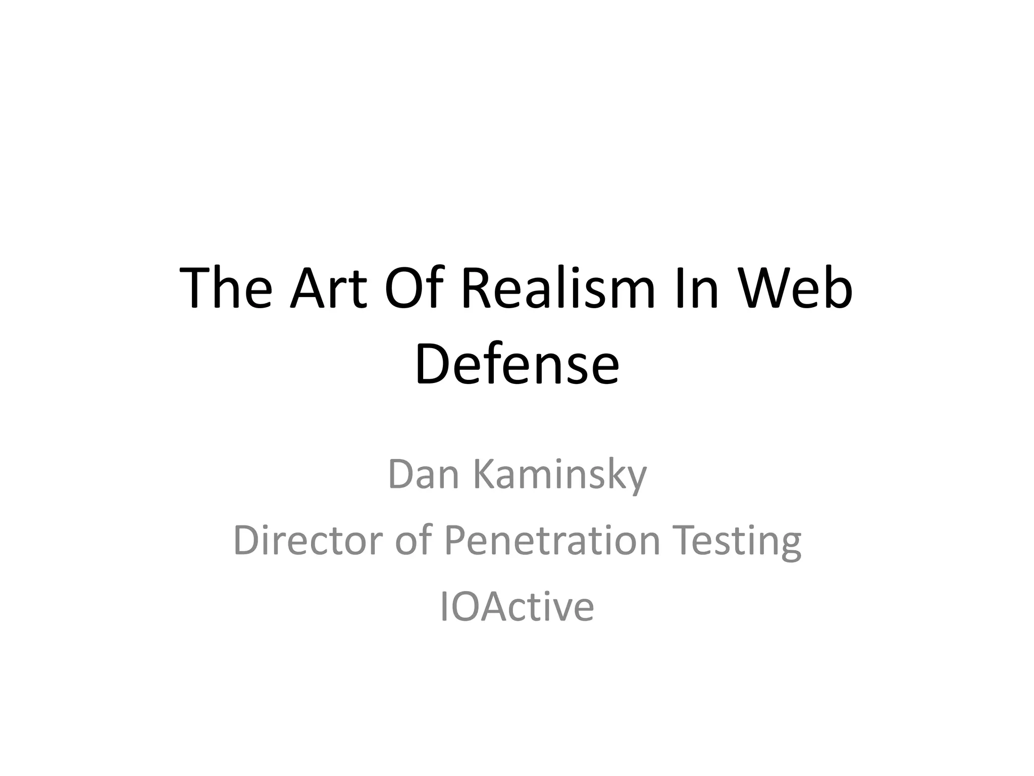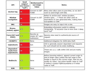 The document discusses securing web applications. It argues that traditional approaches like blaming developers or banning third-party cookies are not effective solutions. Adding random tokens manually to URLs is difficult for developers. Using the referer header is unreliable due to inconsistencies across browsers and plugins. The origin header has similar problems. The document proposes an "interpreter suicide" approach where JavaScript detects cross-site navigation and prevents further execution to block attacks. This provides a client-side way to enforce session context without requiring manual token management.