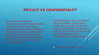 The document discusses the distinction between privacy and confidentiality in healthcare, emphasizing that privacy pertains to an individual's right to limit access to their health information, while confidentiality is the expectation that shared information will be used appropriately. It highlights the Health Insurance Portability and Accountability Act (HIPAA) and its role in protecting private health information, detailing permissible disclosures and the consequences of improper handling. Best practices for maintaining confidentiality and the repercussions of breaches are also outlined, underscoring the importance of adhering to policies regarding patient information.