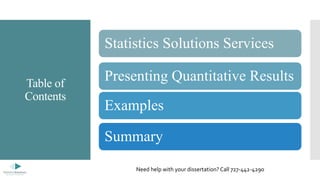 The document outlines the structure and purpose of the results chapter in a dissertation, detailing components such as data collection, demographics, assumption testing, and analysis of research questions. It emphasizes the importance of presenting quantitative results clearly in accordance with research questions and hypotheses while adhering to academic guidelines. Additionally, it offers consulting services for dissertation support, including assistance with various chapters and data analysis.
