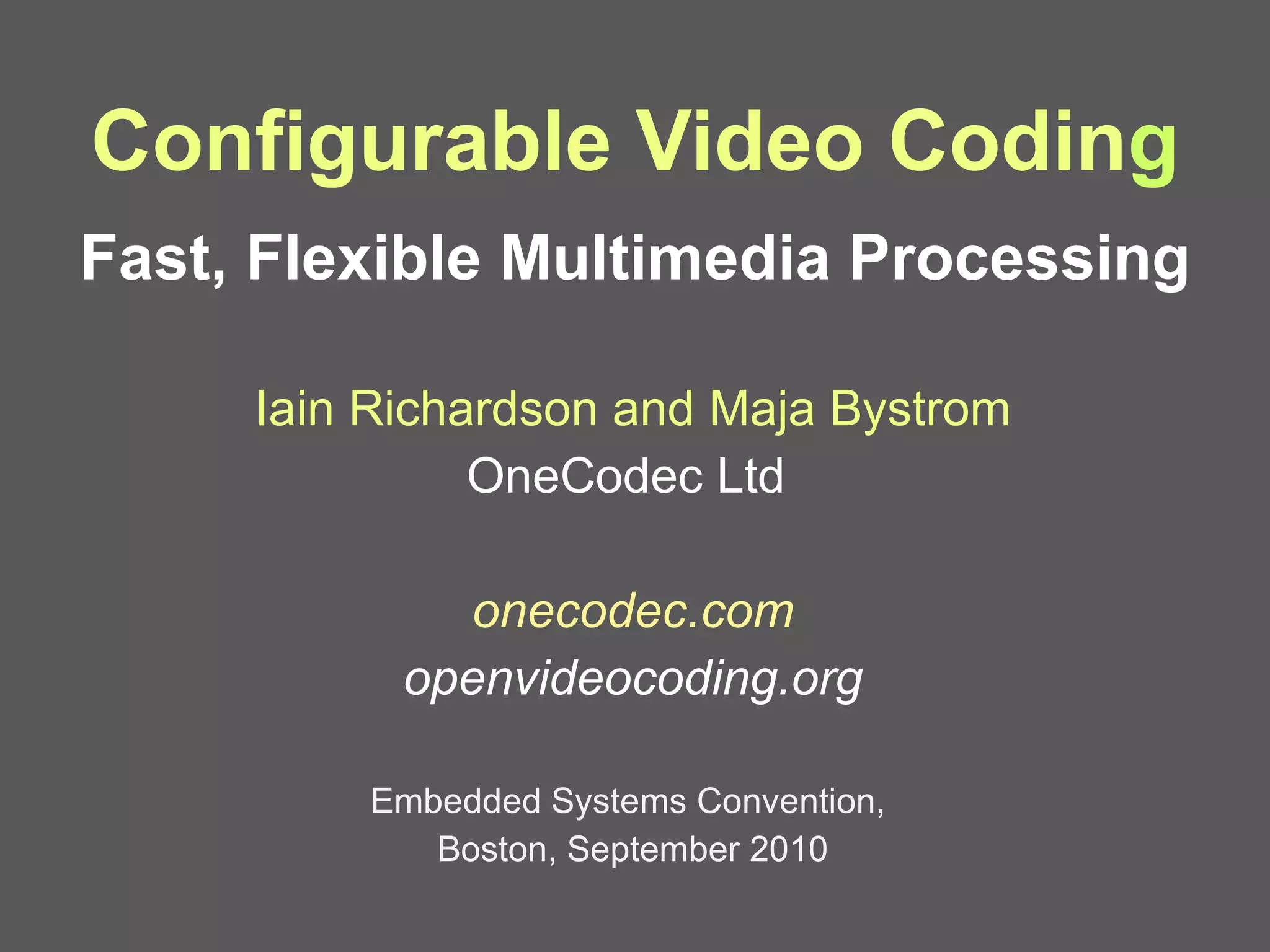 The document discusses configurable video coding, emphasizing a new approach to video compression that allows for customizable performance and quality through reconfigurable video coding (RVC). It highlights the benefits of RVC, such as shorter time to market and better video quality, while also addressing challenges like supporting tools and adaptive coding algorithms. The content is centered around implementing and optimizing video coding and decoding processes using various frameworks and languages.