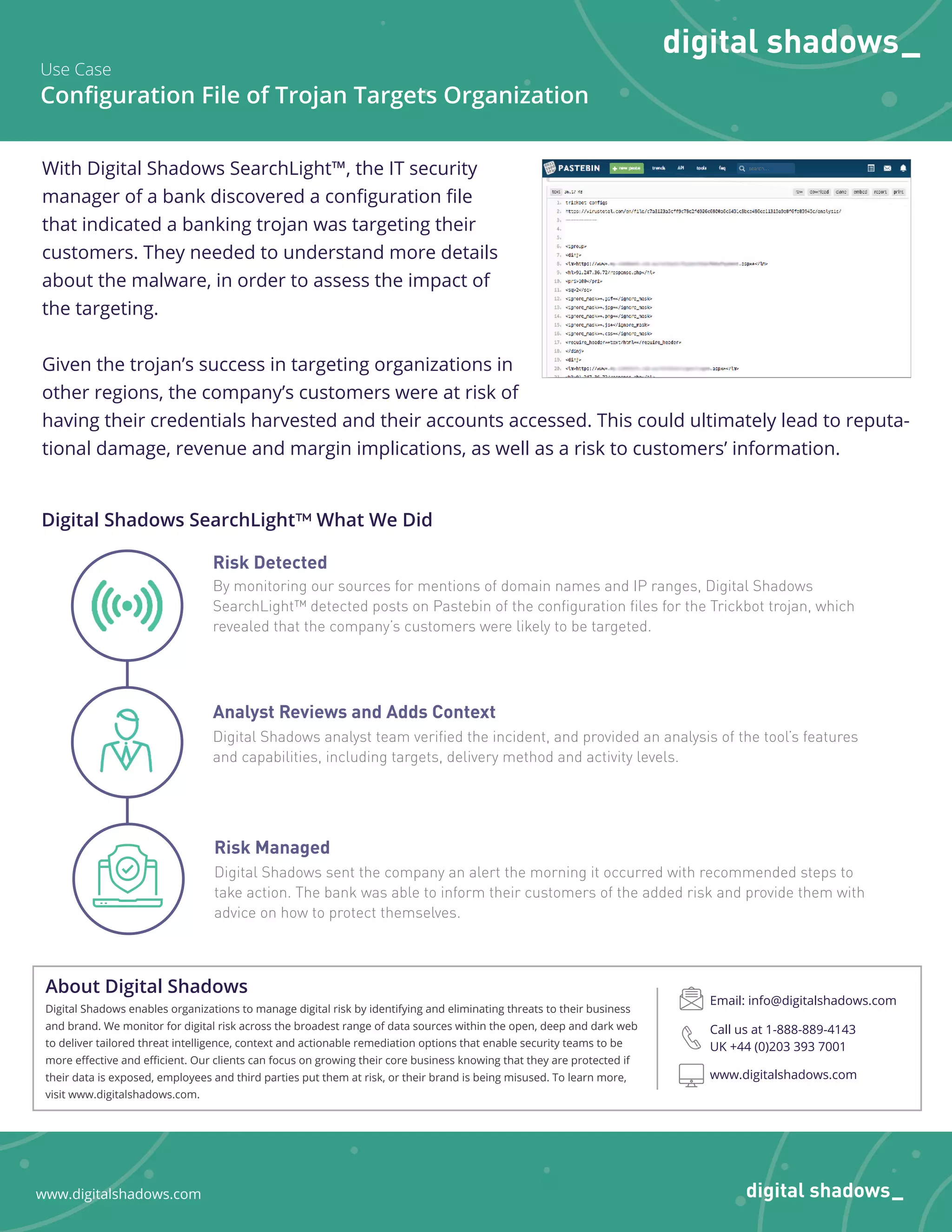 The IT security manager of a bank discovered a configuration file indicating that a banking trojan was targeting their customers, leading to potential credential harvesting and associated risks. Digital Shadows Searchlight detected these threats through monitoring, verified the incident, and provided contextual analysis, enabling the bank to alert customers and implement protective measures. Digital Shadows offers comprehensive digital risk management across various data sources to safeguard organizations' reputation and assets.