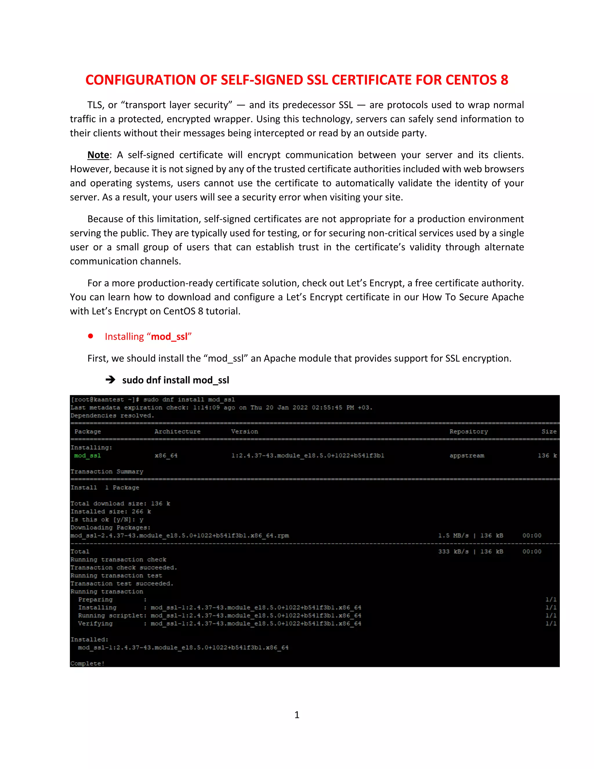 This document provides instructions for configuring a self-signed SSL certificate for an Apache web server on CentOS 8. It explains how to install the mod_ssl module, generate a self-signed certificate and key, configure Apache to use the certificate, and set up redirection from HTTP to HTTPS. While self-signed certificates encrypt communication, they do not validate the server identity to browsers and will result in security warnings for users.