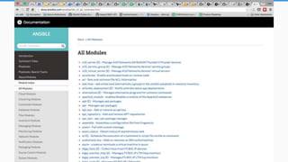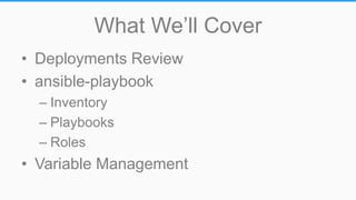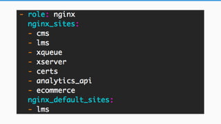 This document provides an overview of Ansible configuration management including deployments, playbooks, roles, variables, and inventory files. It describes how Ansible is used to deploy Open edX including very small two machine deployments, scaling to larger infrastructures, and image based deployments using roles for each application. Key concepts covered are running ansible-playbook commands, playbook and role anatomy, and managing variables across environments.