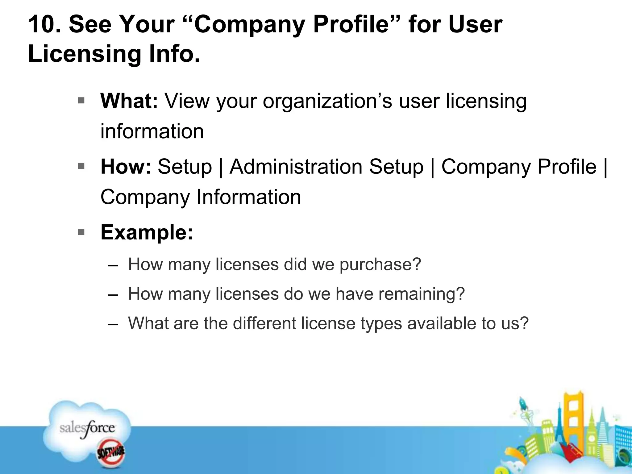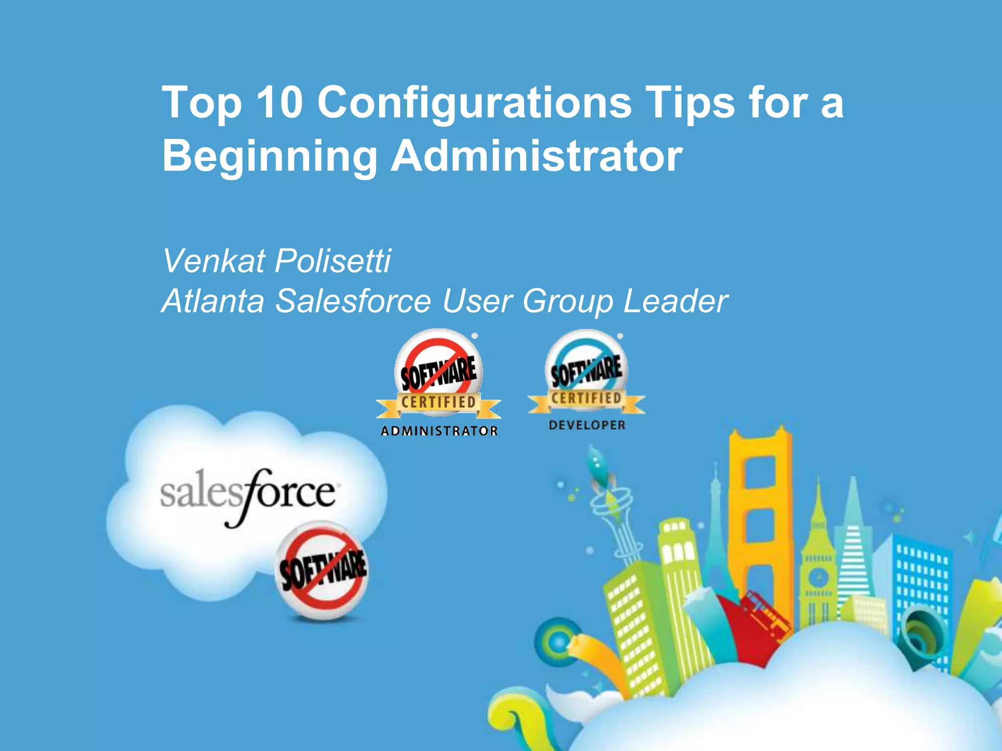 This document provides 10 configuration tips for beginning Salesforce administrators, including viewing licensing information, enabling the new user interface, using the AppExchange, customizing page layouts and apps, using the Data Loader tool, creating personalized sidebar reports, and using cross-object formulas and validation rules. Some key tips include enabling the new UI for features like Chatter, creating profile-based page layouts tailored for different roles, organizing the org using customizable apps, and building sidebar reports that filter data based on the logged-in user.