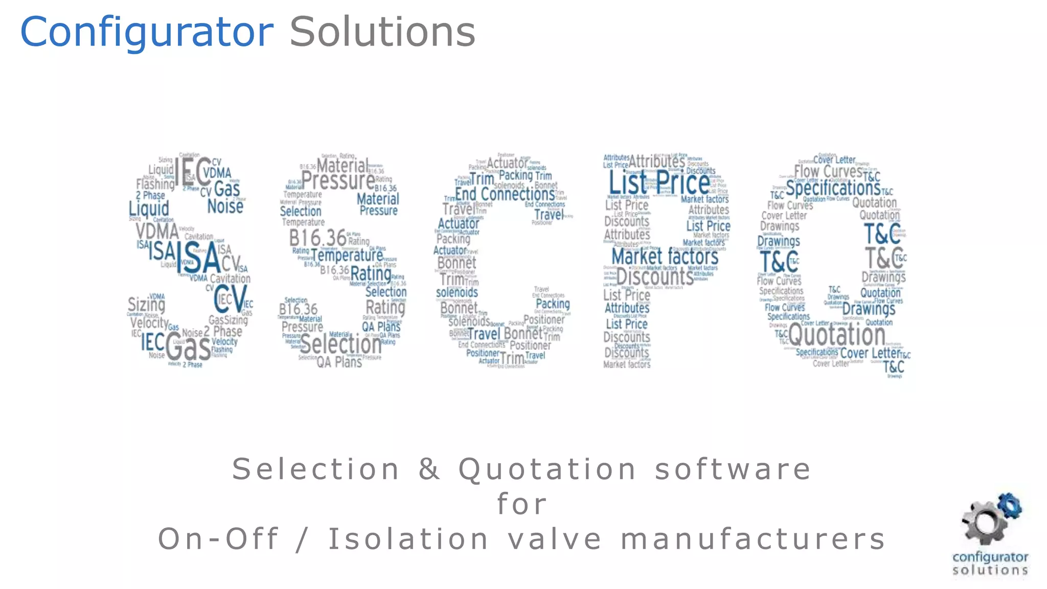 This document describes a software solution for selection, configuration, pricing, and quotation of on-off and isolation valves. The software allows automation of the entire process from inquiry to generating proposals. It features guided product selection, integration with other systems, pricing management, and analytics capabilities. The goal is to help valve manufacturers streamline their sales, engineering, and operations processes.