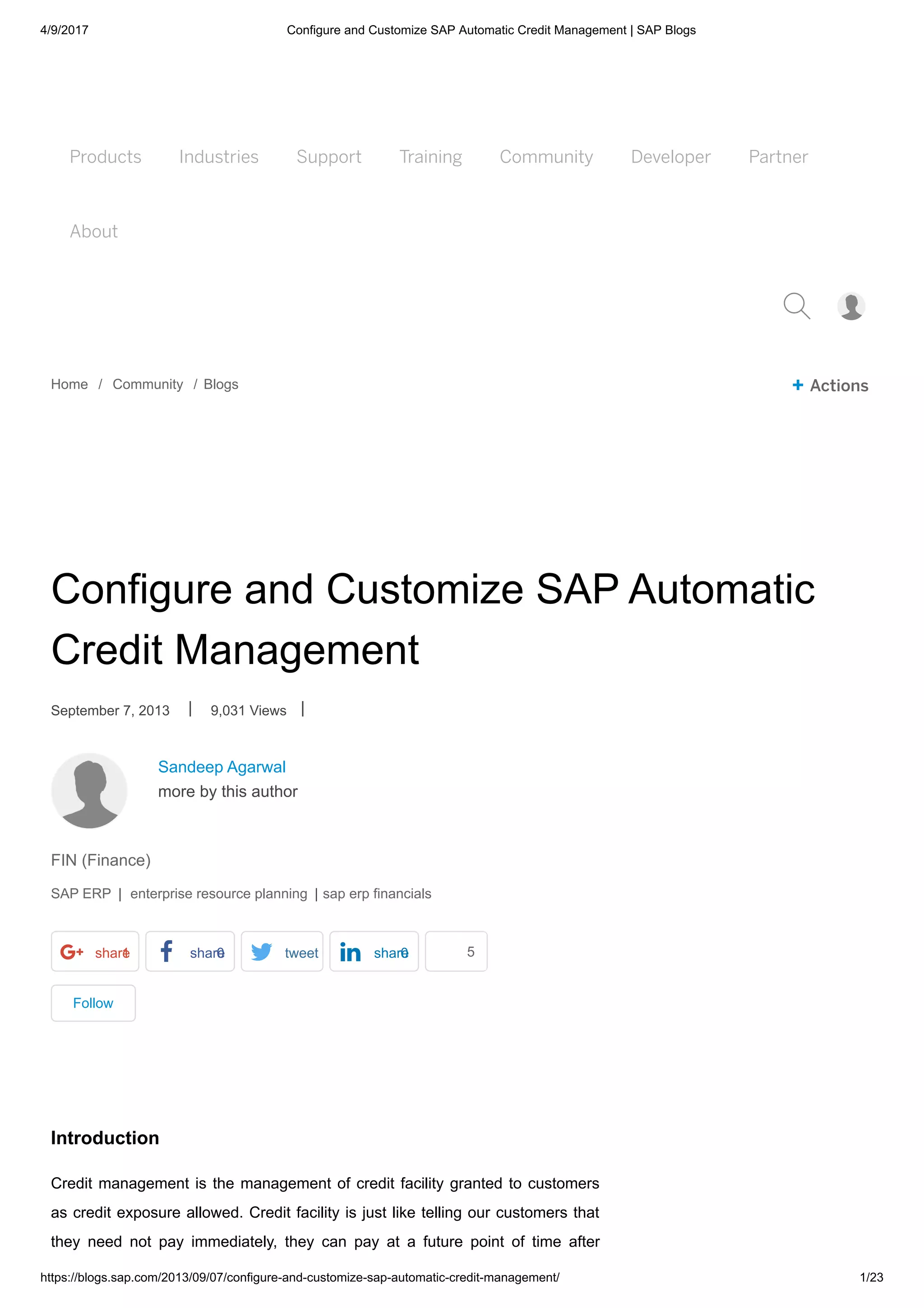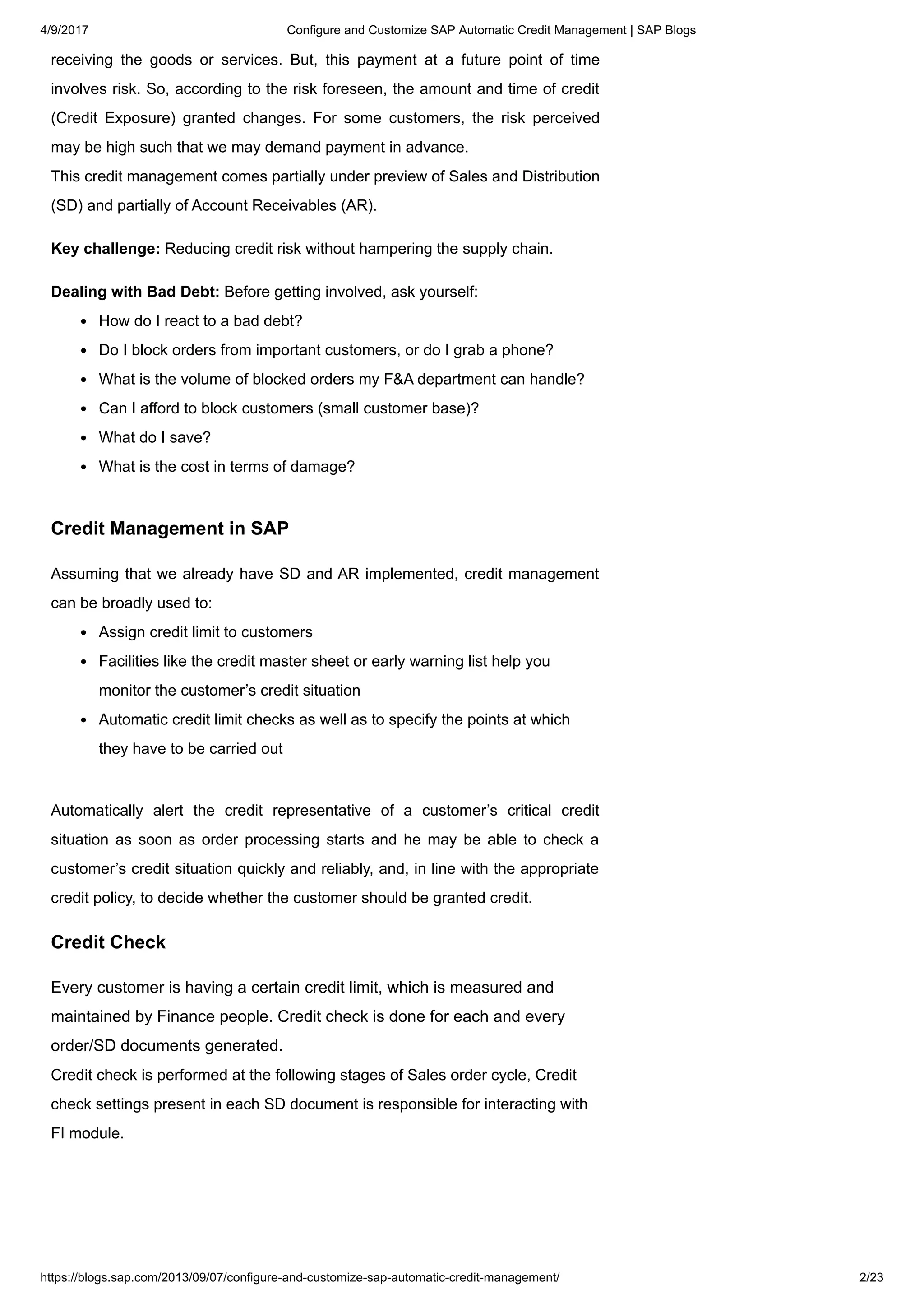 This document discusses how to configure and customize SAP's automatic credit management functionality. It covers defining risk categories and credit control areas, assigning company codes and sales areas, setting up credit groups, and configuring credit limit checks for orders and deliveries. The document also compares simple versus automatic credit checks, noting that automatic checks provide more parameters and are better for high-volume, low-value transactions, while simple checks are preferable for low-volume, high-value situations. Key steps outlined include setting up organizational units, credit limits, and rules for blocking transactions when limits are exceeded.