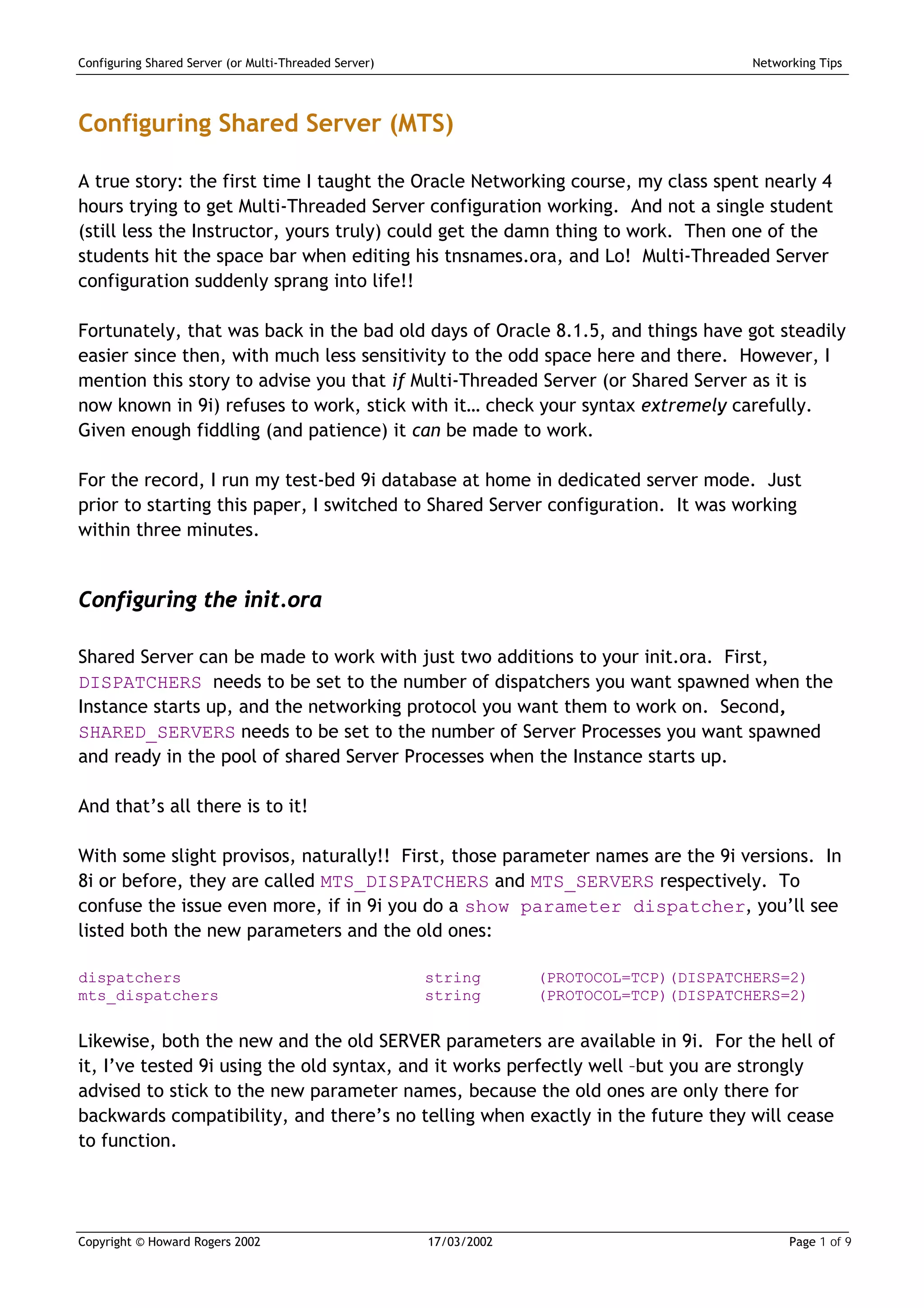 The document provides detailed guidance on configuring Oracle's shared (multi-threaded) server networking, including insights from the author's experience with early challenges in setup. Key parameters for the init.ora file, such as dispatchers and shared_servers, are outlined along with best practices for making the tnsnames.ora more explicit. It emphasizes the importance of careful configuration to optimize performance and includes tips for verifying successful connections in both shared and dedicated modes.