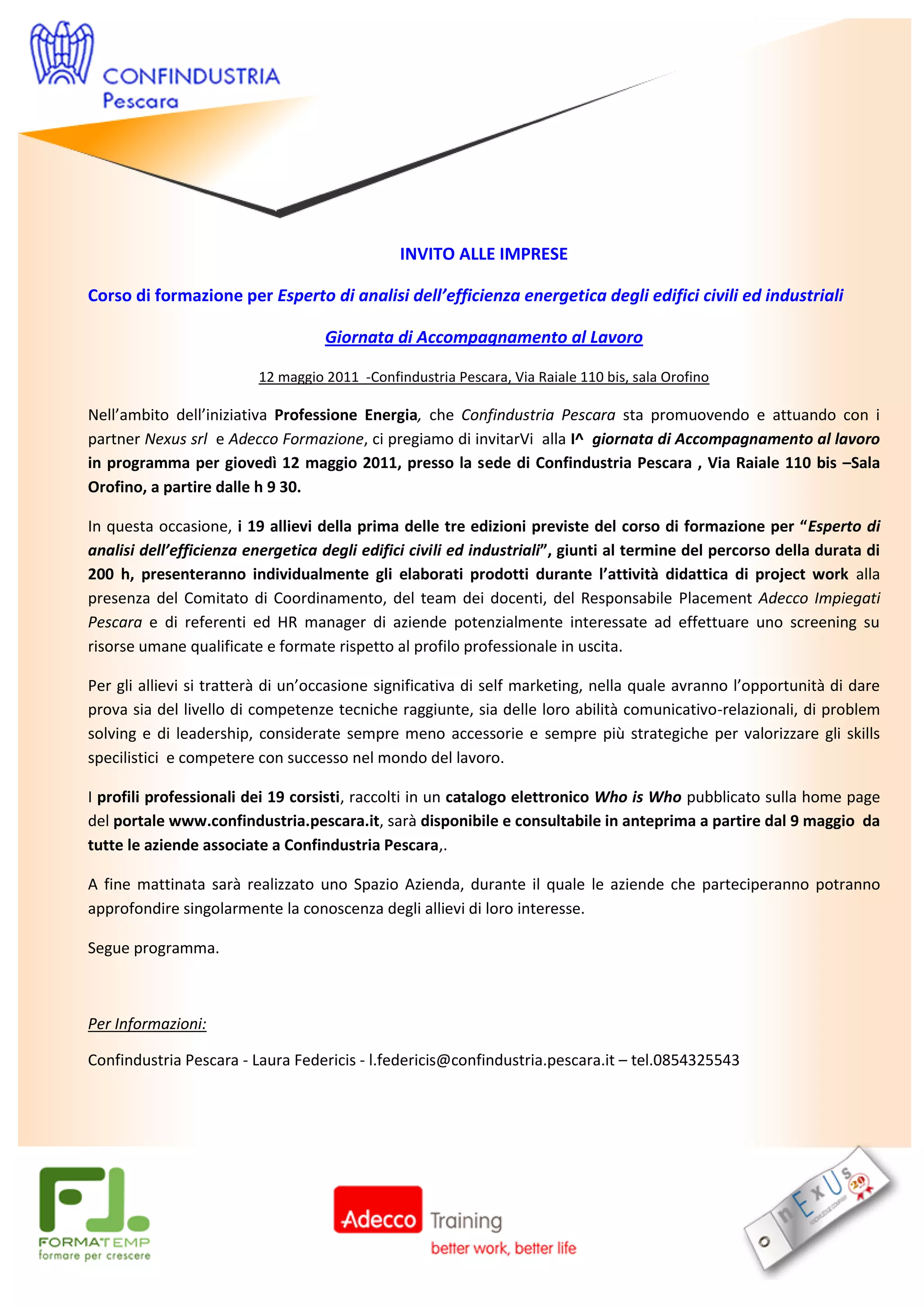 Il 12 maggio 2011, Confindustria Pescara ospiterà una giornata di accompagnamento al lavoro per i laureati del corso di formazione su analisi dell’efficienza energetica. I 19 partecipanti presenteranno i loro elaborati a potenziali datori di lavoro, offrendo un'opportunità per dimostrare le loro competenze tecniche e trasversali. Le aziende avranno anche l'opportunità di colloqui one-to-one con i candidati di interesse.