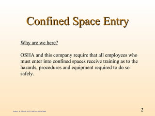 This document discusses confined space entry training. It defines confined spaces and the roles of entrants, attendants, and safety representatives. It outlines hazards like oxygen deficiency, toxic gases, and mechanical/electrical dangers. It emphasizes the need for a permit system where safety representatives evaluate hazards and issue permits before confined space entry.