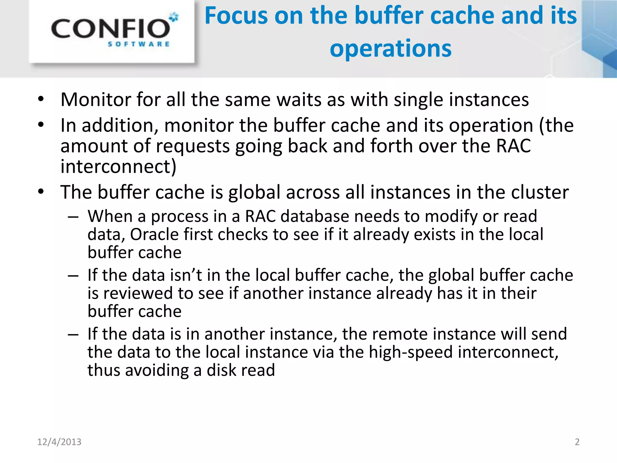 The document discusses monitoring and tuning Oracle Real Application Clusters (RAC) databases. It focuses on the global buffer cache, which is shared across RAC instances. Key waits related to the buffer cache include gc cr request for retrieving data from a remote cache and gc buffer busy waits for a remote instance accessing requested data. Tuning queries to reduce blocks accessed and managing hot blocks can help address buffer cache-related waits. The document recommends using Confio Ignite software to monitor RAC performance at the query level and identify imbalances or excessive overhead causing degraded performance.