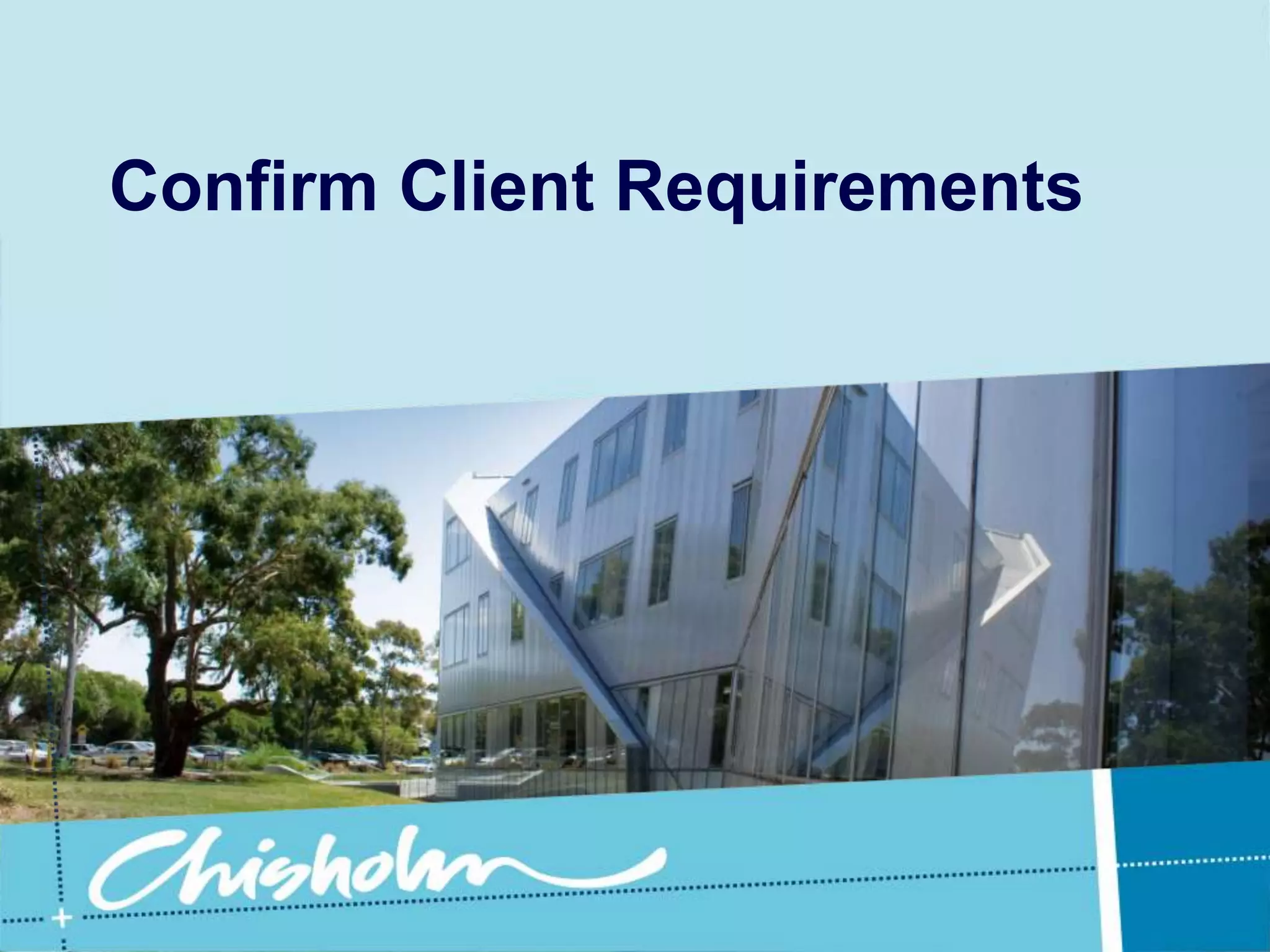 The document outlines steps for confirming client requirements for a network design project. It discusses arranging meetings with the client to understand their business needs and tasks. Key areas to discuss include network size, connectivity requirements, security concerns, software and hardware compatibility, ease of use, warranty and cost considerations. The goal is to create a network plan that addresses the client's priorities and business functions.