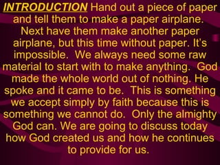 All things came to be when "In the beginning, God created" everything in six days, with man and woman as the crown of His creation. God constantly watches over you and sends his angels to protect you. God causes all plants to grow and provides food for every living creature, demonstrating his ongoing care for his creation.