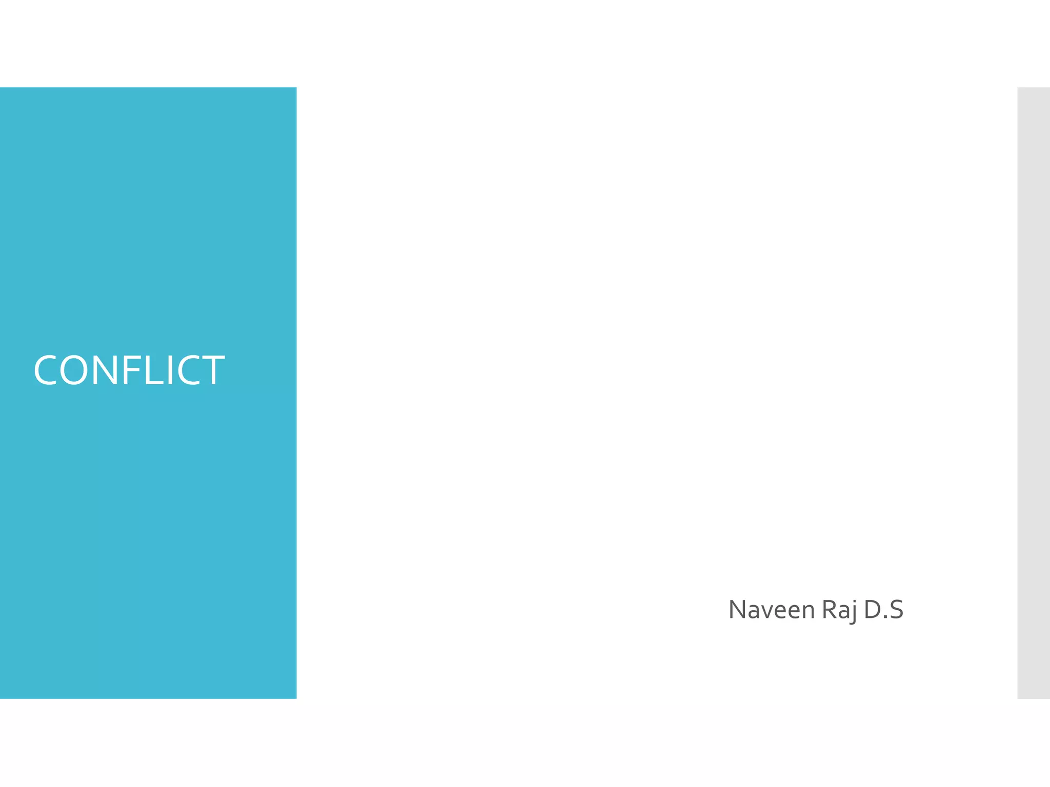 Conflict arises when one party perceives that another party has or will negatively impact something they care about. There are different types of conflict including intra-individual, inter-individual, intra-group, inter-group, and inter-organizational. While conflict can stimulate creativity and innovation, it can also divert energy, waste resources, and damage relationships. Common causes of conflict include communication issues, behavioral problems, and structural factors like role ambiguity or limited resources. Conflict is typically resolved through improved communication, addressing behaviors, or restructuring to reduce tensions between parties. Negotiation is often used to find a mutually agreeable solution through distributive or integrative bargaining approaches.