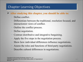 The document summarizes key points about conflict and negotiation from a chapter in an organizational behavior textbook. It defines conflict and outlines the traditional, resolution focused, and interactionist views of conflict. It then describes the five stages of the conflict process as potential opposition, cognition and personalization, intentions, behavior, and outcomes. The document also defines and compares distributive and integrative bargaining approaches to negotiation. It notes how individual differences and culture can influence negotiations. Finally, it summarizes that conflict can be constructive or destructive and offers tips for managing conflict effectively.