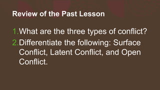 The document discusses conflict escalation, which is the process by which a latent conflict develops over time into an open conflict. It defines the different types of conflicts and stages of escalation. As a conflict escalates, group identities form against the enemy and tactics become more severe. Institutionalization occurs as members increasingly view the other side negatively, fueling fears and desires for revenge. The conflict escalation ladder model outlines how conflicts can escalate in intensity through different stages.