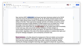 The document discusses Conflict-Free Replicated Data Types (CRDTs), which allow for shared mutable data across multiple users without conflicts. It explains that CRDTs define the shape of shared data models and use metadata to merge concurrent changes without conflicts. A key example shown is a CRDT counter that can be incremented independently by multiple users and still eventually converge to the same count. The document argues that CRDTs enable better collaborative software by making it easier to build applications where data can be edited concurrently and asynchronously without a central server.