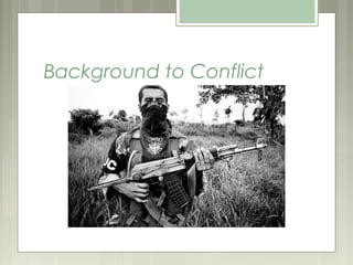 The document summarizes the ongoing conflict in Colombia between the government and peasant guerrilla groups like the FARC. It provides background on Colombia's independence from Spain in the early 19th century and later civil wars between Liberal and Conservative parties over inequality and land ownership. Disputes over coffee and agricultural lands between peasants and landowners have contributed to the conflict. The FARC was formed in 1964 as the military wing of the Communist party and funds operations through kidnapping, drugs, and mining, though it has recently released some prisoners. The conflict has led to displacement of farmers and mental and physical health impacts on communities.