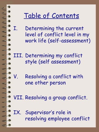 The document provides guidance on conflict management and resolution. It discusses determining the level and source of conflict, identifying one's conflict style, and resolving interpersonal and group conflicts. Tips are provided for supervisors to reduce workplace conflict by being a good leader, addressing issues promptly, and handling employee grievances and complaints in a fair and supportive manner.