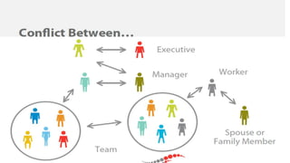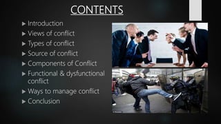 The document outlines conflict management, defining conflict as an active disagreement and emphasizing that it can be both harmful and beneficial. It discusses various views of conflict, its types, sources, components, and the differences between functional and dysfunctional conflict, along with ways to effectively manage it. The conclusion highlights the importance of self-awareness and understanding personal triggers for better handling conflict in the workplace.