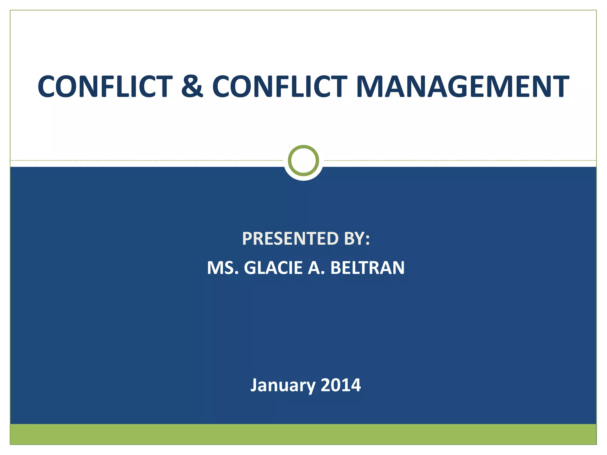 This document provides an overview of conflict and conflict management. It defines conflict as a state of incompatibility or differing desires between parties. The document outlines the types of conflict and their effects, both positive and negative. It then defines conflict management as identifying and handling conflict in a fair, efficient manner. Five basic ways of handling conflict are described: competing, compromising, collaborating, accommodating, and avoiding. The document stresses there is no single best approach and multiple methods may be needed. A six step conflict resolution process is also presented, involving clarifying issues, finding common goals, discussing solutions, addressing barriers, agreeing on approaches, and establishing responsibilities. Effective communication is emphasized for managing conflict.