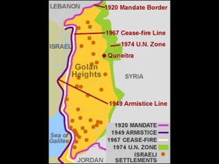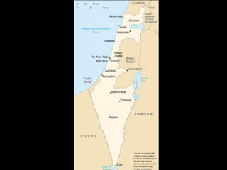 The document provides background on the historical roots of conflict in the Middle East between Israel and its neighbors. It summarizes the key wars and peace accords over time, including the 1948 Arab-Israeli War of Independence, the 1967 Six Day War, the 1973 Yom Kippur War, and peace accords such as the 1979 Camp David Accords and the 1993 Oslo Accords. It notes that the status of Jerusalem and boundaries of a Palestinian state remain divisive issues with no permanent resolution yet.