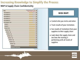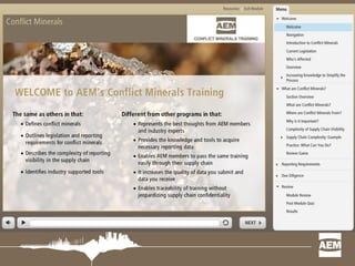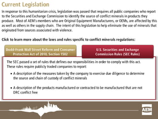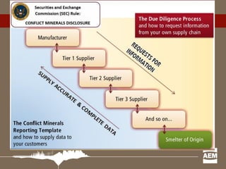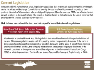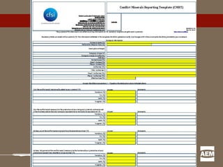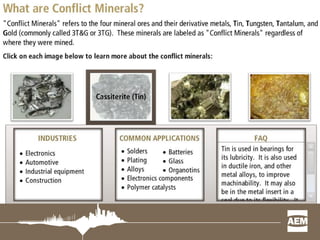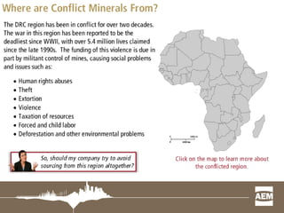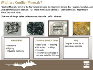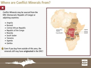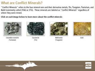 The document provides an overview of conflict minerals, their origin, and their presence in products. It discusses the challenges of reporting and introduces the Conflict Minerals Reporting Template (CMRT) as well as training solutions offered by the Association of Equipment Manufacturers. Contact information for the director of materials management, John Wagner, is also provided.