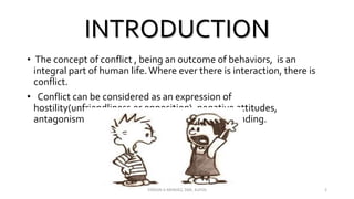 The document discusses the concept of conflict, defining it as the perception of differences in opinions, interests, or goals that negatively affect something a party cares about. It notes conflict is natural and can be functional or dysfunctional. The document outlines various views on conflict and describes the stages of conflict from potential incompatibility to outcomes. It also discusses types of conflict at the individual, group, and organizational levels and methods for managing conflict, including resolution techniques like problem solving, compromise, and altering human or structural variables.