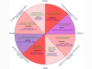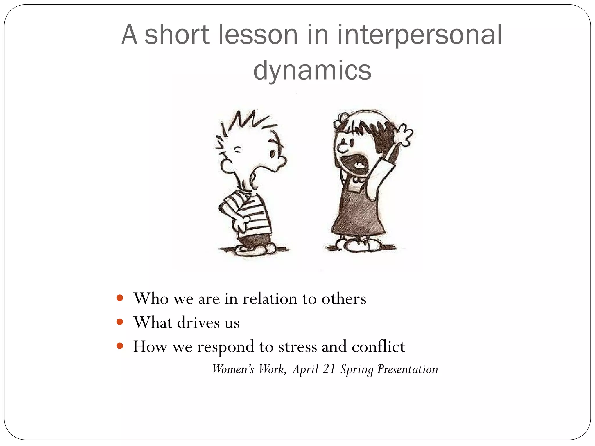 This document discusses interpersonal dynamics and conflict styles. It describes four main types of personalities - The Team Player, The Adventurer, The Queen, and The Analyst - based on where they fall on scales of flexibility vs. rigidity and internal vs. external focus. It also outlines five types of conflicts based on their underlying causes. Finally, it introduces three conflict styles - The Turtle (withdrawing), The Shark (forcing), and The Teddy Bear (smoothing) - based on how individuals typically respond to conflicts. The overall document provides a framework for understanding personalities, sources of conflicts, and common conflict response tendencies.
