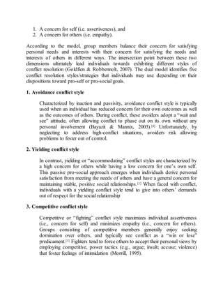 Conflict resolution involves facilitating a peaceful end to conflict through communication and collective negotiation. There are a variety of conflict resolution methods, including negotiation, mediation, diplomacy, and peacebuilding. Conflict resolution styles are informed by individuals' level of concern for themselves and others, with cooperation seen as the most effective style as it involves finding solutions agreeable to all parties. Culture also influences approaches to conflict resolution, as direct communication may be considered rude in some cultures.