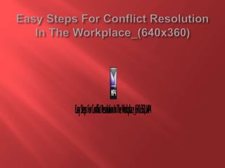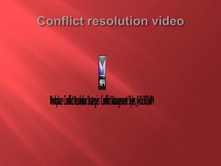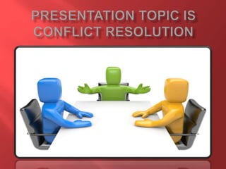 This document discusses organizational conflict and conflict resolution. It defines organizational conflict as discord between people working together due to opposing needs, values, and interests. There are four main types of organizational conflict: interpersonal, intrapersonal, intragroup, and intergroup. Conflict resolution is the process of reaching an agreement to end a disagreement or dispute. It aims to find a peaceful solution that all parties can agree on through negotiation and understanding different perspectives. The document outlines seven steps for successfully negotiating conflict resolution: understand the conflict, communicate, brainstorm solutions, choose the best solution, use a mediator, explore alternatives, and cope with pressure.