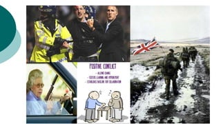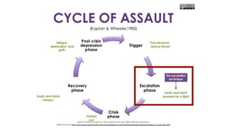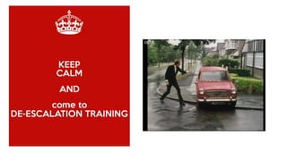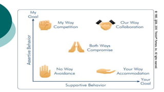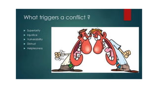 Conflict resolution involves handling disagreements correctly to promote growth. It is important to resolve conflicts through collaboration rather than avoidance, accommodation, competition, or compromise. The key steps in conflict resolution are to not procrastinate, remain calm, listen, empathize, understand each person's needs, develop cooperative options, and find a win-win approach. De-escalating tense situations safely involves reducing arousal, speaking calmly, giving space, setting limits respectfully, and acknowledging feelings while addressing unsafe behavior.