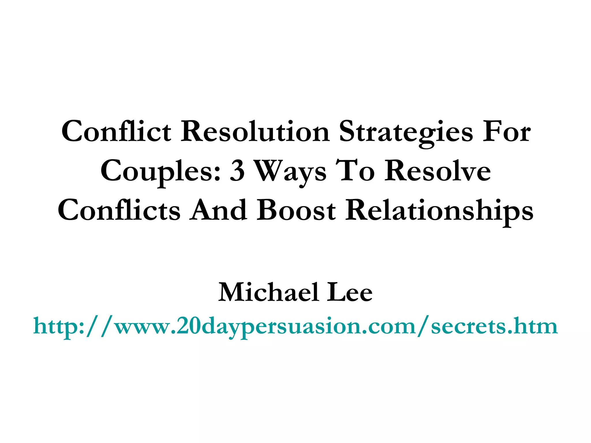Michael Lee outlines three effective conflict resolution strategies for couples to enhance their relationships: negotiation, mindful conversation, and timing. Negotiation involves reaching compromises without increasing tension, while mindful conversation focuses on the choice of words to prevent misunderstandings. Finally, recognizing when to step back and cool down can help prevent escalation during emotional moments.