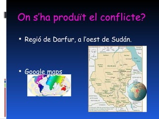 Per què s’haproduït el conflicte? Va començar al 2003 entre dues poblacions: entre la població negra i la d’origen àrab. (les dues musulmanes). Degut a l’augment demogràfic de les dues poblacions i a la sequia, Darfur es va quedar sense recursos. L’arribada al poder en 1989 d’un règim militar islamista va afavorir els grups d’ètnia àrab davant dels agricultors negres.