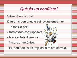 Què és un conflicte ? Situació en la qual : Diferents persones o col·lectius entren en oposició per: - Interessos contraposats. - Necessitats diferents. - Valors antagònics. - El triomf de l'altre implica la meva derrota.