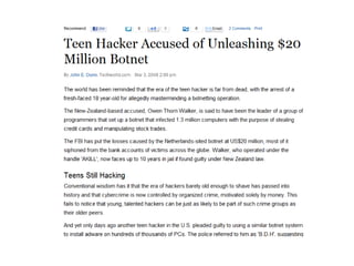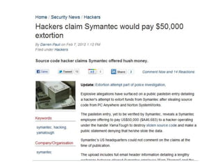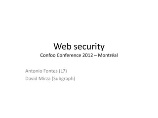This document summarizes a presentation on web security given at the Confoo Conference in 2012. The presentation was given by Antonio Fontes from L7 and David Mirza from Subgraph. They discussed the history of web attacks moving from host/network intrusion to modern vulnerabilities like XSS and SQL injection. They explained that all business logic and data is now on the web, making it the main target for attacks. The motivations for these attacks include money, ideology, fame, and supporting other criminal activities. They outlined the impacts such as financial costs, reputation damage, and legal/compliance issues. Finally, they provided recommendations on technical controls like web application testing and process controls like secure development practices and training to help address these ongoing