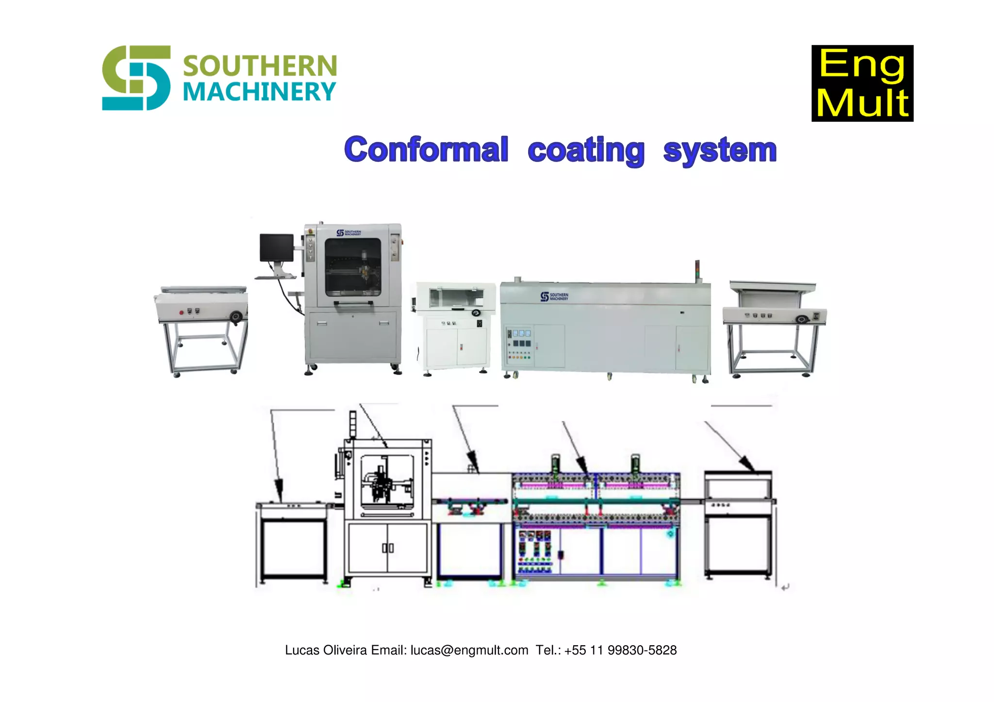 The document discusses an automated selective coating machine. It provides details on the machine's specifications, features, and technical advantages. The machine aims to create a friendly and healthy workshop environment through features like ventilation systems, wind curtains, and exhaust structures. It also offers excellent coating quality through precision nozzles and motion control. The machine is controlled through an IPC and includes advanced accessories from manufacturers like Panasonic, SMC, and OMRON. It can be easily programmed and includes features like automatic cleaning and level alarms.
