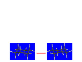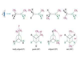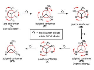 The document discusses conformations and rotational isomers in organic molecules. It begins by defining conformations as different arrangements of atoms or groups in a molecule that can be interconverted by rotation about single bonds. These conformations have different internal dimensions but similar energies, with carbon-carbon single bond rotation barriers typically under 1 kcal/mol.