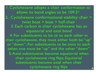This document discusses the structure and properties of cyclohexane. Cyclohexane adopts a chair conformation with sp3 hybridized carbon atoms forming 120 degree bond angles. The chair structure is stable due to minimizing 1,3-diaxial interactions between axial substituents which experience more steric hindrance than equatorial substituents. Newman projections are used to illustrate axial and equatorial substituents in the chair conformation of cyclohexane.