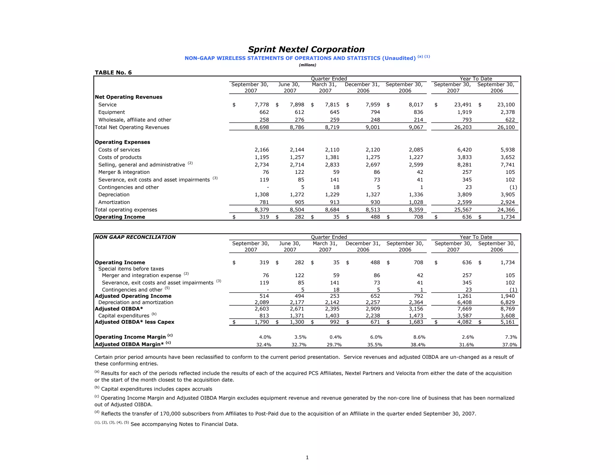 This document provides a summary of Sprint Nextel Corporation's non-GAAP wireless statements of operations and statistics for the quarter ended September 30, 2007 and year-to-date. It shows operating revenues, expenses, operating income, and other financial metrics. It also includes reconciliations between GAAP and non-GAAP measures such as adjusted operating income and adjusted OIBDA. Key notes further explain special items and non-recurring expenses such as merger and integration costs.