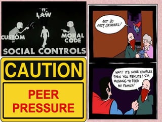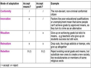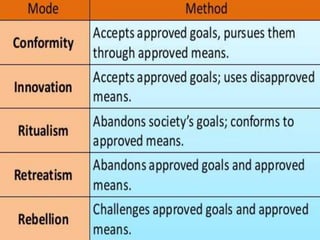 This document summarizes several key concepts related to conformity, deviance, and theories of deviance. It discusses conformity as behaving according to social norms and deviance as violating norms. It then outlines several theories of deviance, including Merton's strain theory, which links deviance to a gap between cultural goals and legitimate means to achieve them. Labeling theory holds that deviance results from being labeled as such rather than inherent acts. Social control theory suggests people conform due to social attachments. The document also discusses concepts like human rights and dignity.