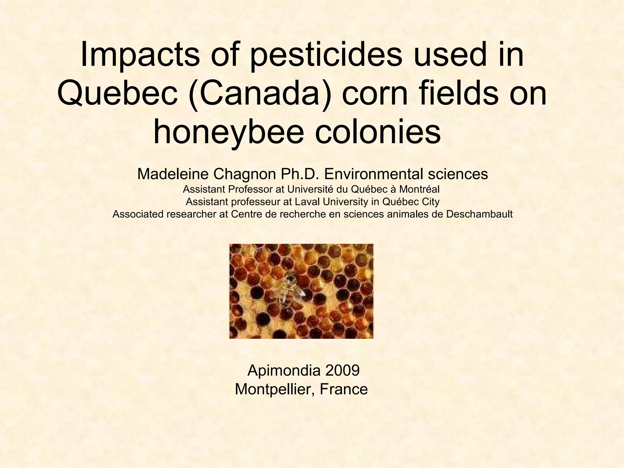 1) The study examined the impacts of pesticides used in corn fields in Quebec on honeybee colonies. Experiments showed higher honeybee mortality and weaker hives in fields with moderate-to-high pesticide usage compared to low usage or control fields.