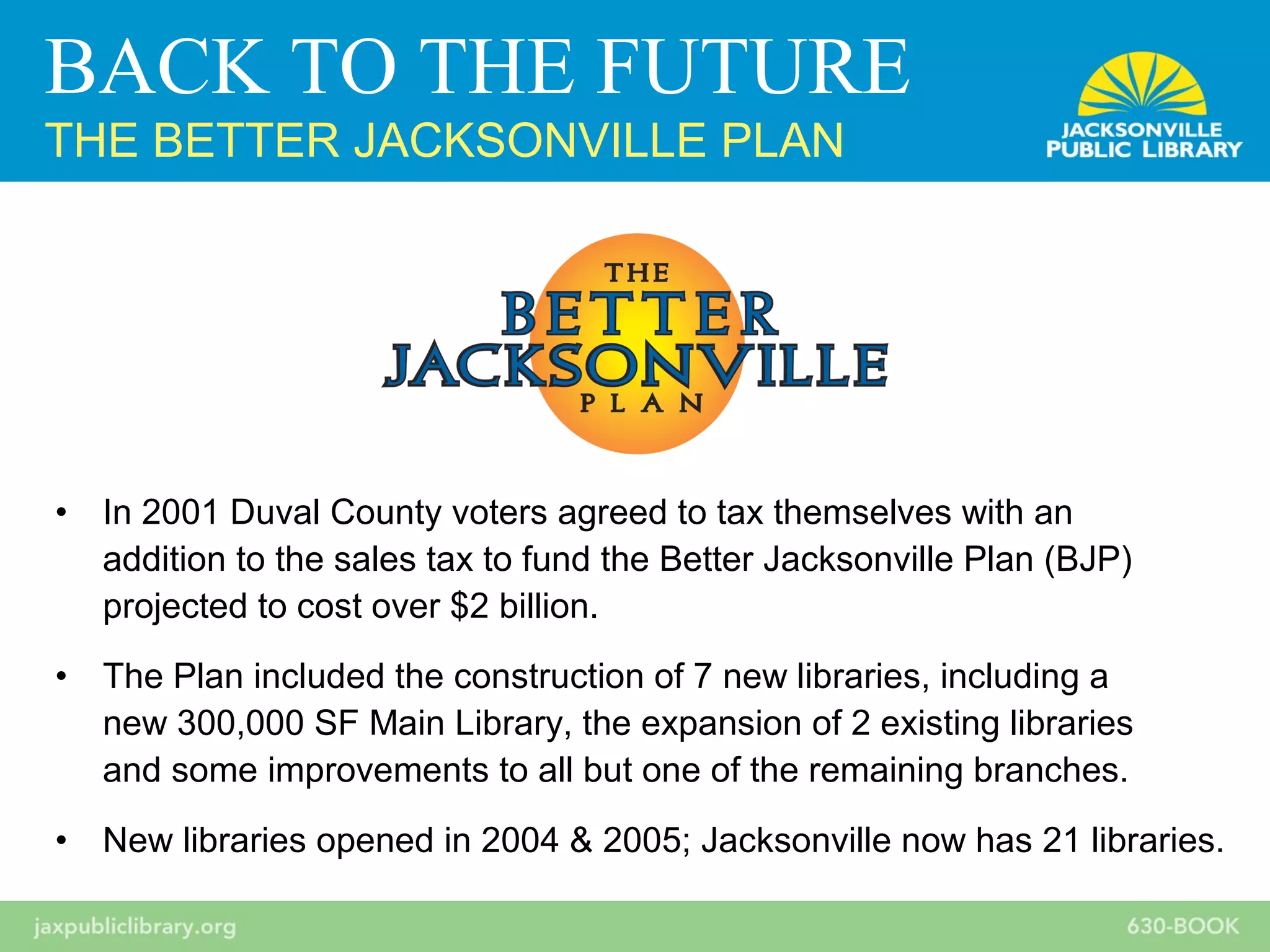 The document summarizes the history and current state of the Jacksonville Public Library system in Florida. It describes how a sales tax increase in 2001 funded the construction of new libraries through the Better Jacksonville Plan, but that funding has since been reduced. A capacity planning process in 2010-2011 made recommendations to stabilize funding, maintain buildings, remedy inequities, and ensure flexibility. The plan discussed strategies like strengthening digital services, balancing individual and community roles, and adapting staff competencies for the future.