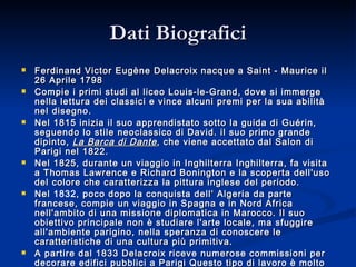 Eugène Delacroix, nato nel 1798, fu un pittore romantico influenzato da viaggi e dall'uso del colore, noto per opere come 'La Grecia morente sulle rovine di Missolungi'. Theodore Géricault, nato nel 1791, rappresentò la sofferenza umana con opere come 'Corazziere ferito che abbandona il campo di battaglia', riflettendo una visione anti-eroica. Entrambi artisti utilizzarono colori cupi e uno spazio deformato, ma affrontarono temi distintivi: Delacroix con la resistenza eroica e Géricault con la sconfitta e la vulnerabilità.