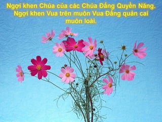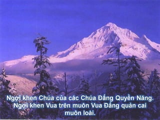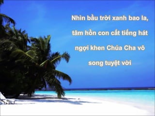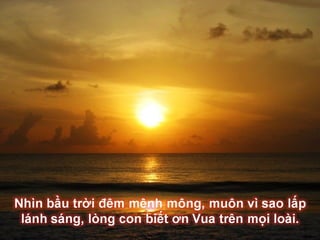 Tài liệu là một bài ca ngợi ca ngợi thiên nhiên và vinh quang của Chúa. Nó nhấn mạnh sự hiện diện và quyền năng của Chúa trong công việc của Ngài, kêu gọi mọi người hướng về sự ca ngợi và tôn thờ. Bầu trời được miêu tả như một chứng nhân cho sự vinh hiển của Chúa và là nguồn cảm hứng cho lòng thành kính.