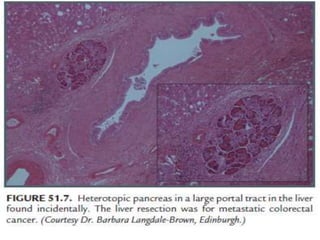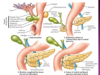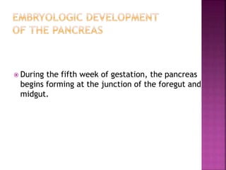 The document summarizes several pancreatic duct anomalies including pancreas divisum, annular pancreas, and ectopic pancreas. It describes the embryological development and classification of each anomaly. For pancreas divisum, it discusses diagnosis using ERCP, MRCP, or EUS and treatment options like endoscopic sphincterotomy or stenting of the dorsal duct. For annular pancreas, it describes the classification and presentations in infants versus adults. Surgical bypass is the preferred treatment. Ectopic pancreas most commonly involves the gastric antrum and is often asymptomatic.