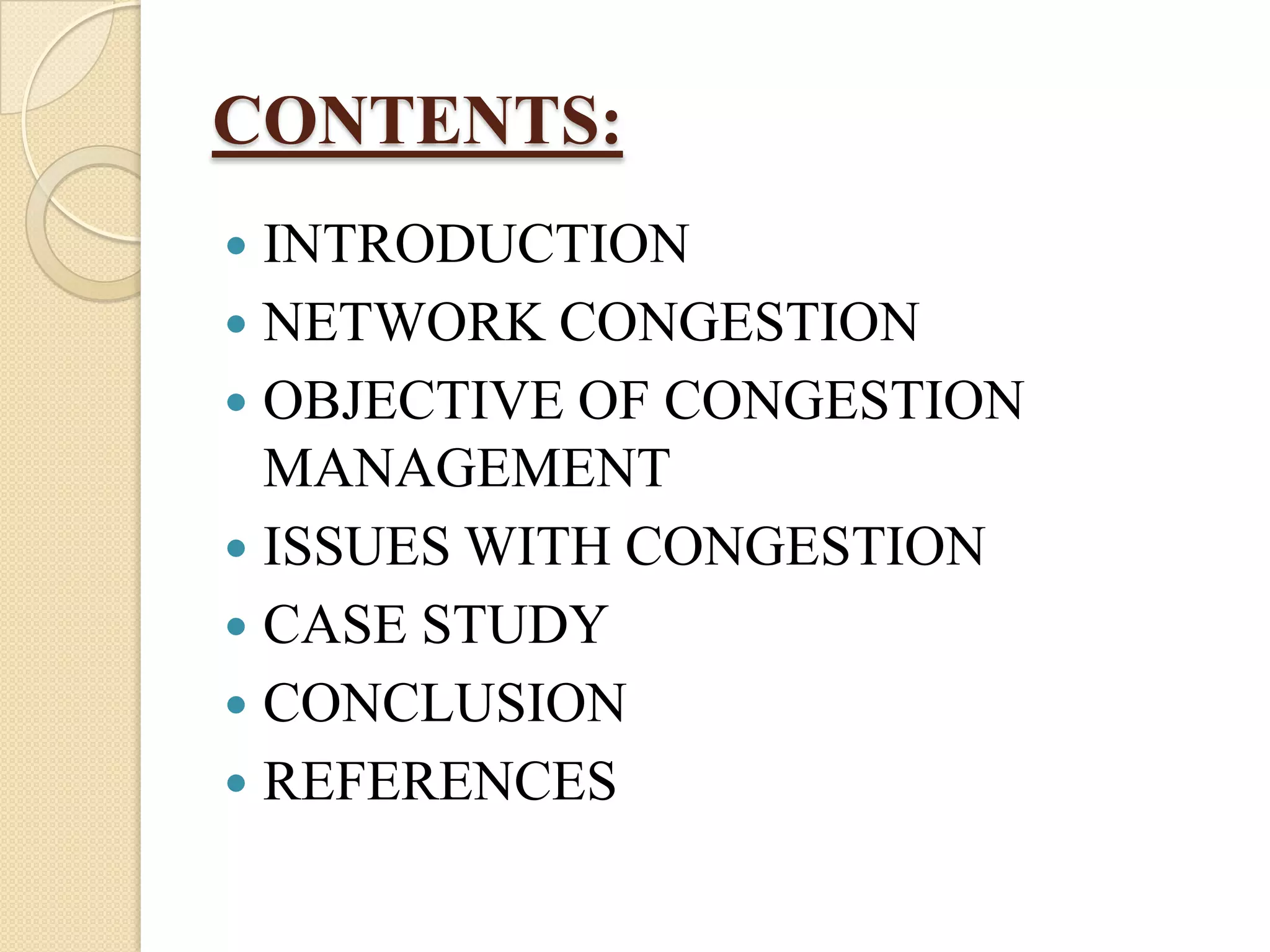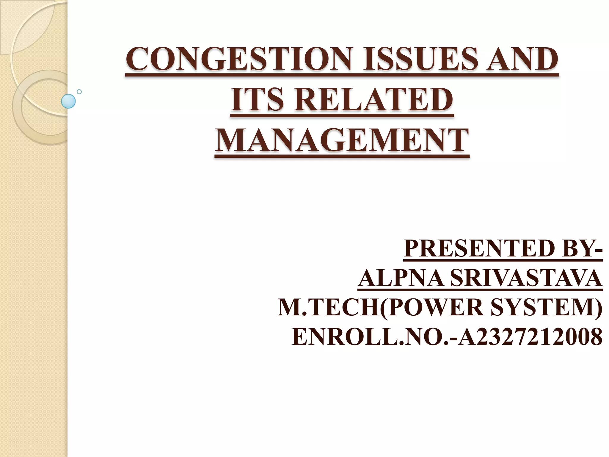 This document discusses congestion issues and management in power systems. It defines congestion as overloading of transmission lines which can be caused by outages, load increases, or equipment failures. Congestion management aims to minimize market interference, secure operations, and improve efficiency. Facts devices can help relieve congestion by controlling power flows. The document presents a case study on congestion management methodology used in Thailand and provides results showing a congested transmission line exceeding its limit in a IEEE 30-bus system model. It concludes that congestion can be managed through methods like transmission line loading relief which identifies overloaded lines and curtails transactions impacting those lines.