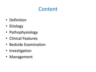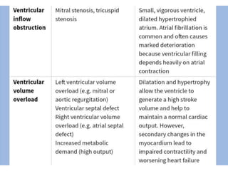 This document provides information on congestive cardiac failure (CCF), including its definition, pathophysiology, clinical features, investigations, and management. CCF occurs when the heart muscle is weakened and cannot maintain adequate cardiac output. The pathophysiology involves changes in preload, afterload, and contractility that decrease cardiac output. Compensatory mechanisms initially help but later worsen symptoms. Clinically, CCF presents with dyspnea, edema, elevated JVP, hepatomegaly, and other signs. Investigations include BNP, ECG, echocardiogram. Management focuses on treating the underlying cause, reducing preload/afterload, and improving contractility. Diuretics, ACE inhibitors, beta